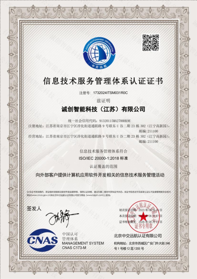 ISO20000信息技術服務管理體系證書