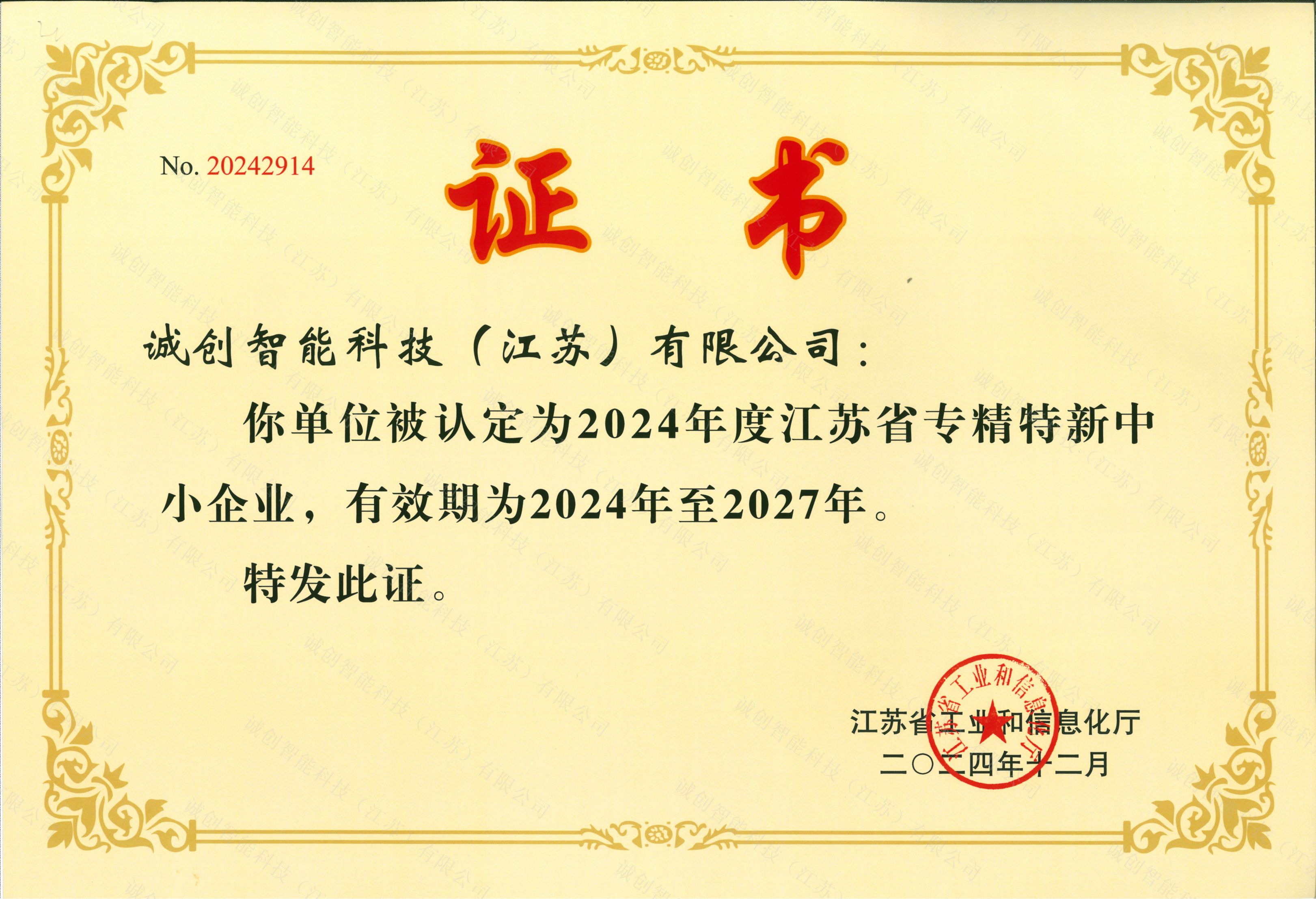 江蘇省專精特新中小企業證書