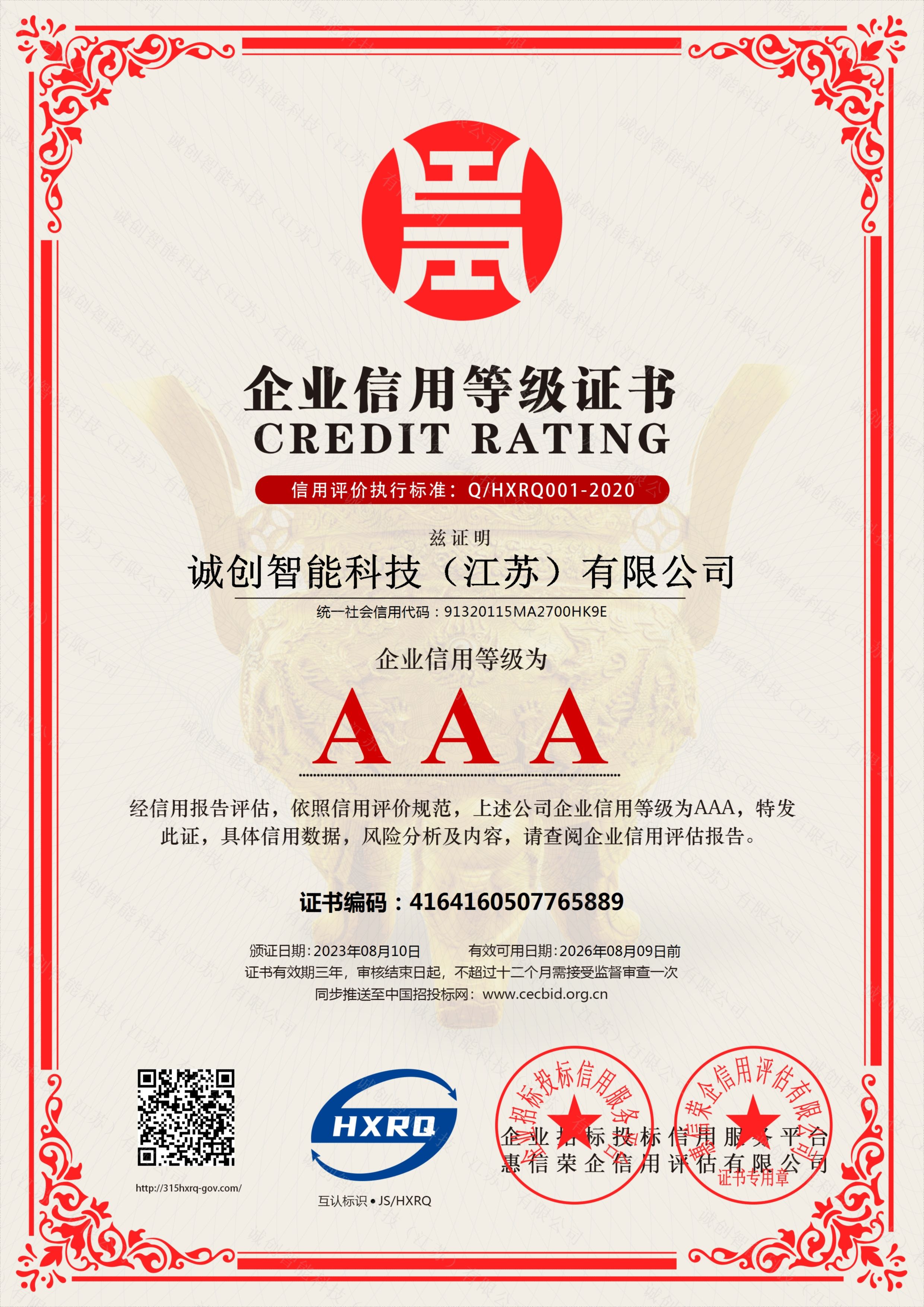企業信用等級3A證書