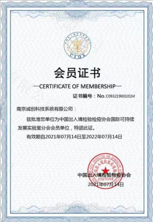 中國出入境檢驗檢疫協會可持續發展實驗室分會會員證書
